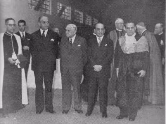 O reitor pe. Pedro Belisário Velloso Rebello S.J., com autoridades no ginásio da PUC-Rio durante a cerimônia de inauguração da nova sede na Gávea em 17/07/1955.