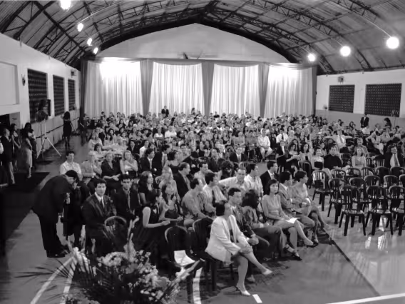 Jovens jogam capoeira no palco do ginásio da PUC-Rio. Vê-se, ao fundo, a plateia.