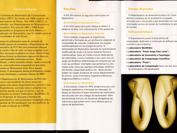 Folheto de divulgação da PUC-Rio. Gráficos ao longo dos anos com o total de alunos e professores, diplomados, valor do salário-aula e valor das anuidades. Fotos do Palacete Joppert, representando 1941, do Ed. Cardeal Leme, representando "Hoje" e da maquete com o projeto para o campus Gávea representando "Quando?".