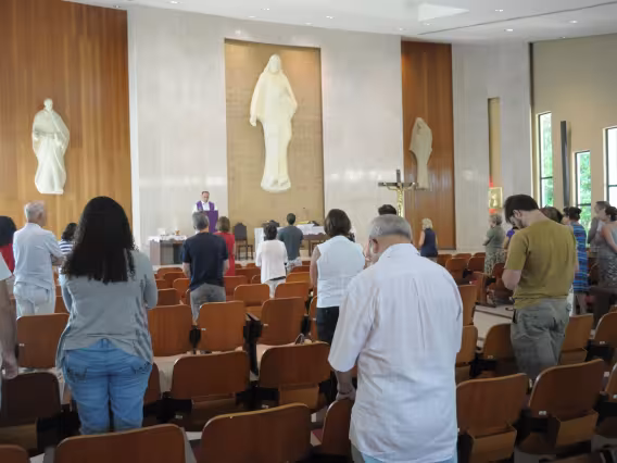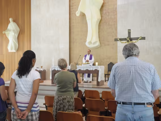 Código exclusivo eg0124_008 Coleção Missa de um ano do falecimento do professor Luíz César Monnerat Tardin Data de criação 05/03/2012 Natureza do documento imagem Tipo de documento fotografia cor Descrição Funcionários, amigos e familiares durante a missa.