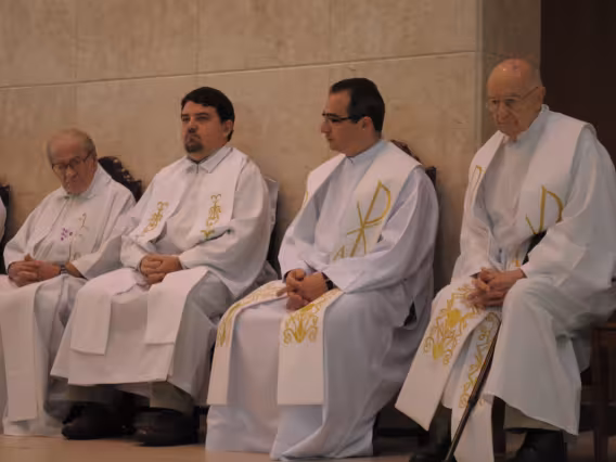 Código exclusivo mp0003_010 Coleção Missa em comemoração ao Sagrado Coração de Jesus, patrono da PUC-Rio Data de criação 15/06/2012 Natureza do documento imagem Tipo de documento fotografia cor Descrição Padres presentes à missa, no altar.