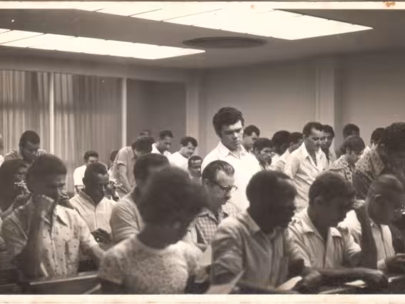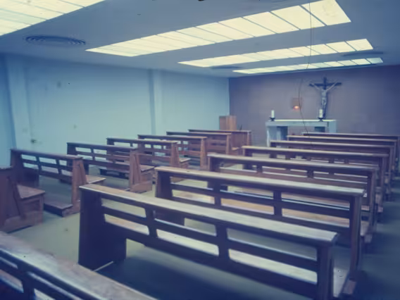 Antiga capela da PUC-Rio, no térreo do Edifício Cardeal Leme, com o crucifixo de madeira que agora [2017] está na Igreja do Sagrado Coração de Jesus.