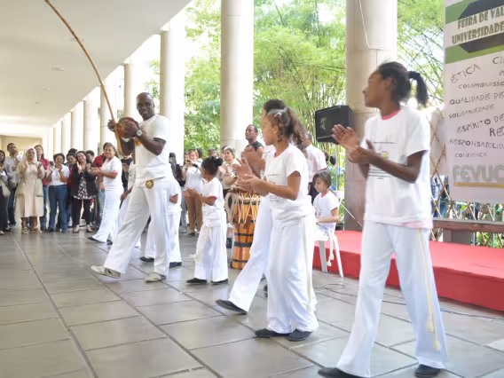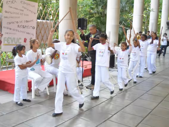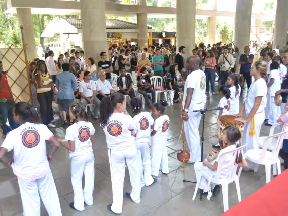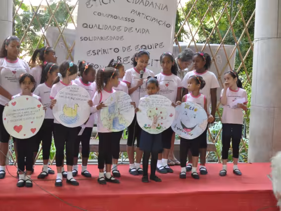 Crianças interagem com painel de projeto educacional não identificado.