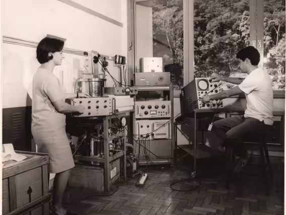 Código exclusivo cg0072_083 Coleção Fotos do Acervo do Departamento de Física Data de criação 01/01/1965 Natureza do documento imagem Tipo de documento fotografia PB Descrição Pessoas em laboratório.