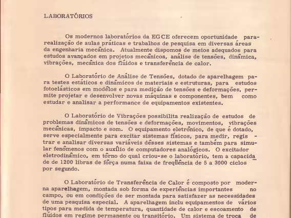 Seção referente à 'Engenharia Mecânica', incluindo o objetivo do programa, laboratórios e campos principais, no Catálogo oficial da Escola Graduada de Ciências e Engenharia (EGCE), 1968 - 1969.