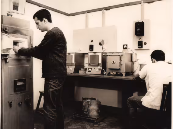 Cartaz sobre as oportunidades para Estudo Graduado em Ciências e Engenharia na PUC-Rio: Engenharia Civil, Engenharia Elétrica, Engenharia Mecânica e Física. Com fotos de laboratórios, do computador Burroughs e a lista das disciplinas específicas e comuns a todas as áreas.