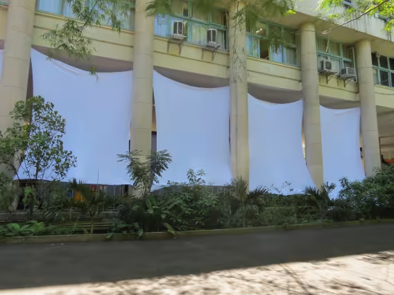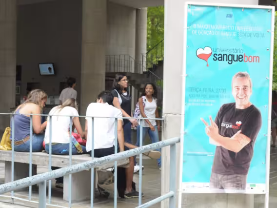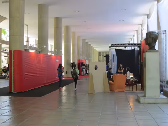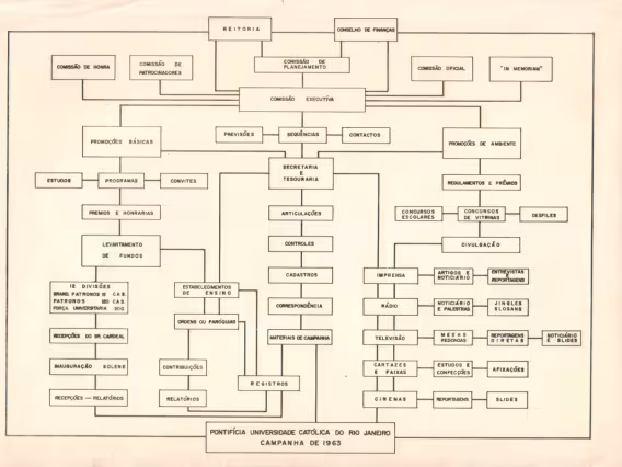 Os pilotis da Ala Kennedy sustentam as instalações da exposição 'Centenário David Ogilvy', realizada por alunos dos Departamentos de Comunicação e de Artes e Design da PUC-Rio em homenagem ao célebre publicitário escocês.