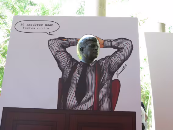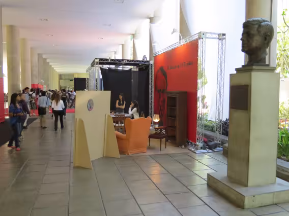 Instalação da exposição 'Centenário David Ogilvy' aproveita o busto de Kennedy nos pilotis. O evento foi realizado por alunos dos Departamentos de Comunicação e de Artes e Design da PUC-Rio em homenagem ao célebre publicitário escocês.