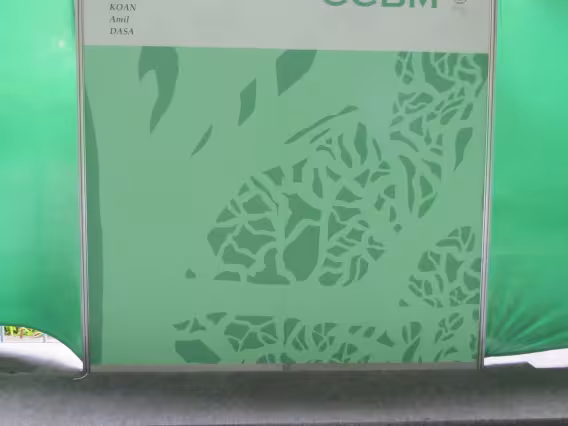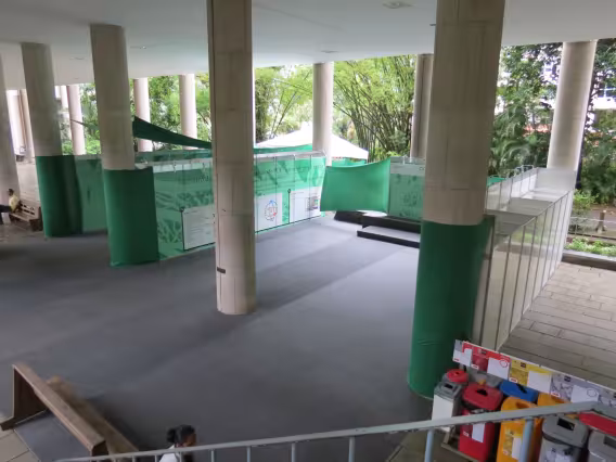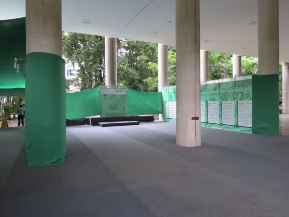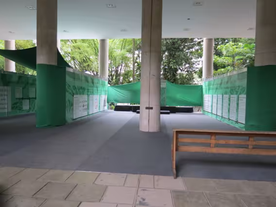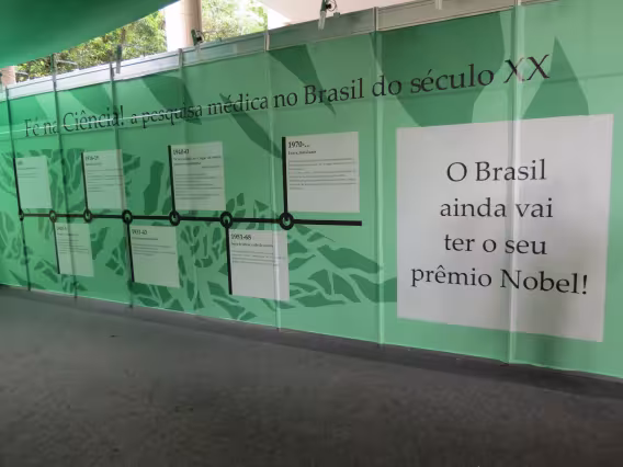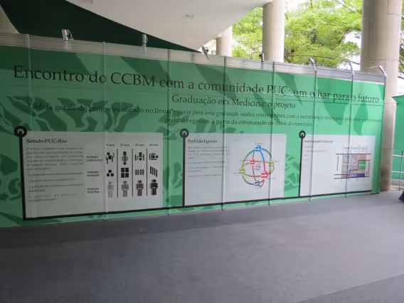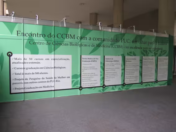 Painel de divulgação dos projetos do Centro de Ciências Biológicas e de Medicina da PUC-Rio, como a consolidação da graduação em Ciências Biológicas e o projeto de criação de uma graduação em Medicina.
