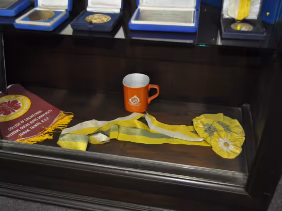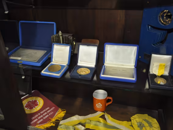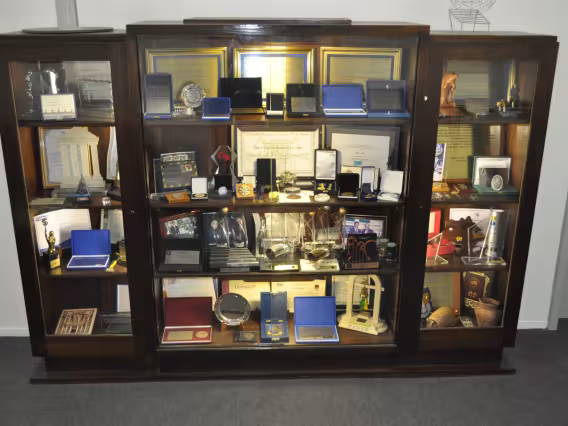 Armário da sala de entrada da reitoria com placas, medalhas, diplomas, pratos brasonados, esculturas e prêmios recebidos de instituições de ensino superior e empresas, memorabílias da PUC-Rio e porta-retratos do pe. Jesús Hortal Sànchez, S.J., com autoridades.