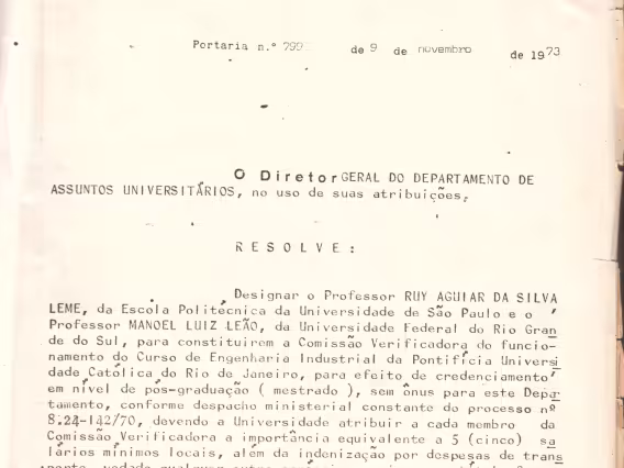 Código exclusivo cg0017_001 Coleção Credenciamento do Curso de Mestrado em Engenharia Industrial (Produção) no Conselho Federal de Educação - 1973 Data de criação 09/10/1973 Descrição Designação, pelo MEC, dos nomes que constituiriam a Comissão Verificadora do funcionamento do curso de Engenharia Industrial da PUC-Rio.