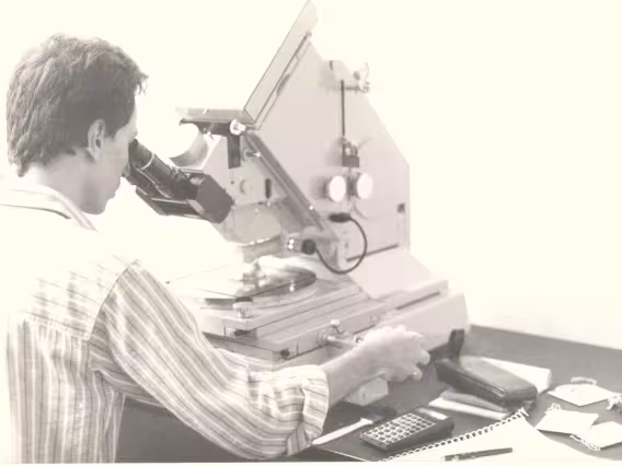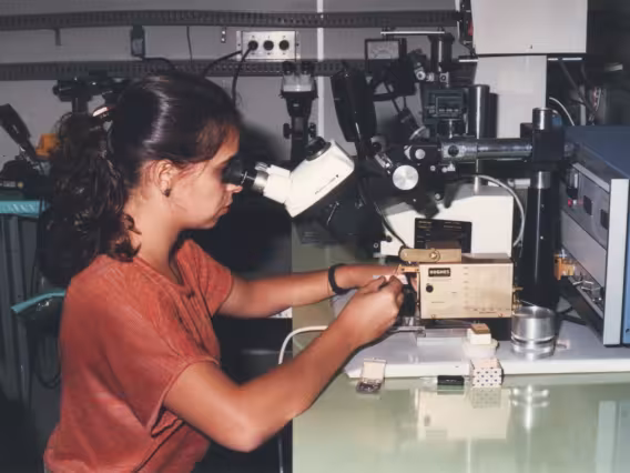 Pessoa opera equipamento com apoio de microscópio em laboratório.
