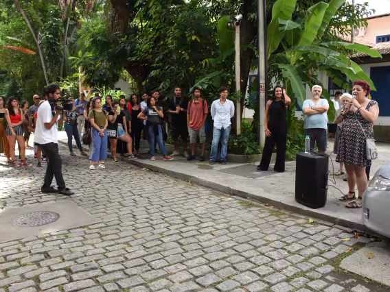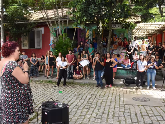Código exclusivo lm0003_003 Coleção Cerimônia extra-oficial de nomeação da Vila dos Diretórios Marielle Franco Data de criação 14/03/2019 Natureza do documento imagem Tipo de documento fotografia cor Descrição Estudantes reunidos durante a homenagem com discurso de Rafaela Magnani, aluna do curso de Design e integrante da gestão Primavera do DCE.