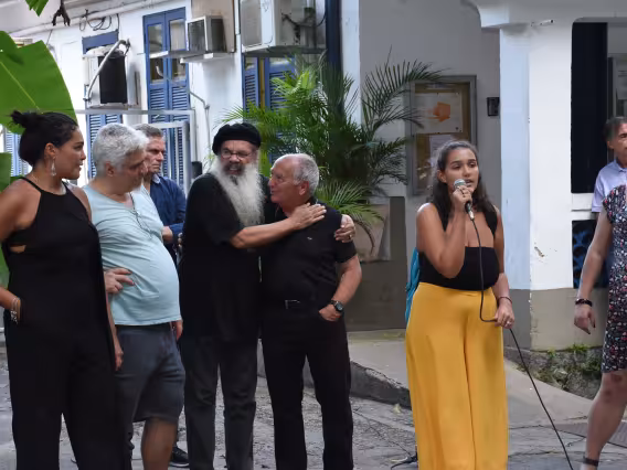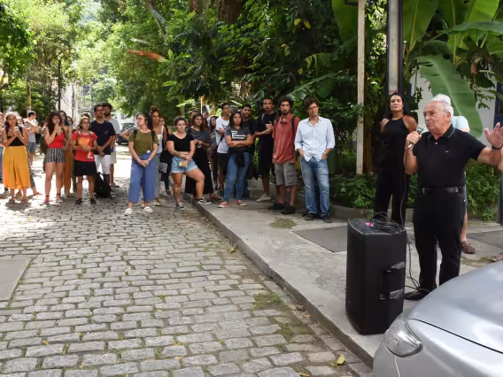 Código exclusivo lm0003_008 Coleção Cerimônia extra-oficial de nomeação da Vila dos Diretórios Marielle Franco Data de criação 14/03/2019 Natureza do documento imagem Tipo de documento fotografia cor Descrição Discurso do professor e Vice-reitor Comunitário Augusto Sampaio.