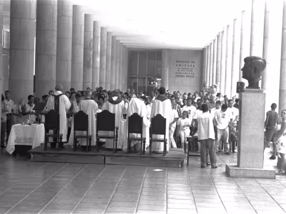 Padres cerimonialistas, coral e funcionários na missa de Natal de 2000.