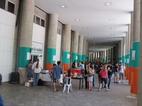Escadas e pilotis do Bloco D do edifício Cardeal Leme decorados com faixas laranja e verde com propagandas de chapas que disputavam as eleições de 2011 para o Diretório Central dos Estudantes da PUC-Rio (DCE).