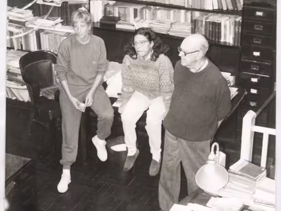 O crítico literário Afrânio Coutinho com a equipe da Oficina Literária Afrânio Coutinho (OLAC). A fotografia foi publicada em matéria do Jornal da PUC sobre a OLAC, suas atividades e a precariedade sobre o local em que funcionava.