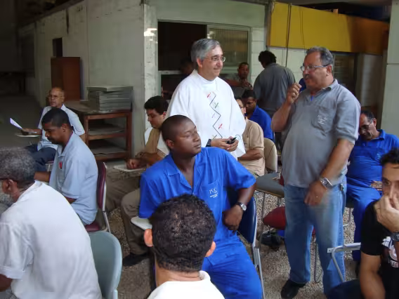 O prefeito do campus, Eduaurdo Lacourt, e funcionários da PUC-Rio acompanham a missa ao Dia de São José Operário - 1 de maio - realizada dois dias depois, em frente às oficinas da Universidade.