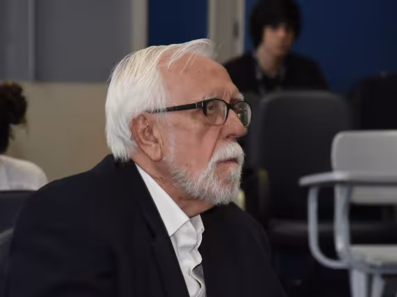 Mesa com palestrantes e plateia presente ao evento.