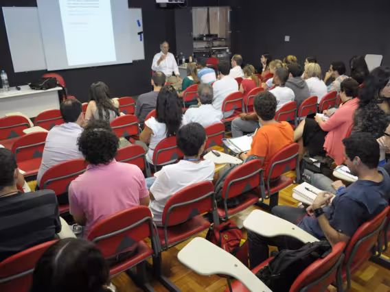 Código exclusivo cg0050_041 Coleção Acervo de Fotos do Projeto Comunicar - cont. Data de criação 01/01/1980 Descrição Seminário Interno realizado no auditório ade Química com a presença de professores e do reitorPe. Mac Dowell.