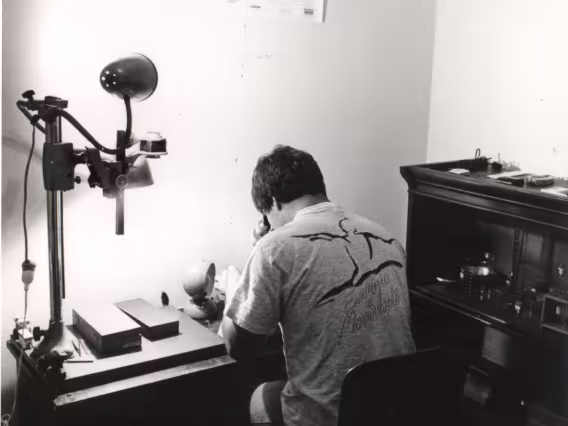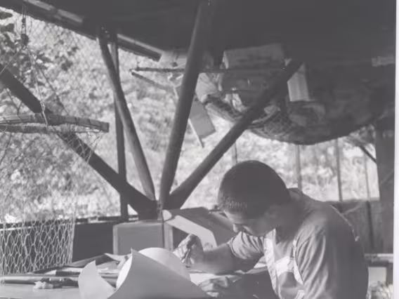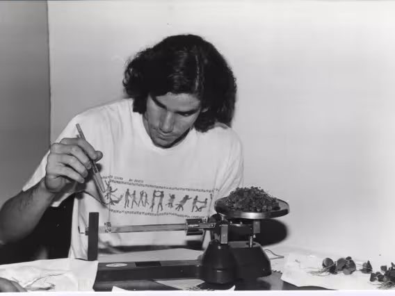 Fotografia publicada em matéria do Jornal da PUC sobre a inauguração do Laboratório de Ecologia Vegetal. Ligado ao Departamento de Geografia, o laboratório era coordenado pelo prof. pe. Josafá Carlos de Sigueira S.J.. Na foto, o aluno Francisco Da Matta realiza pesquisa sobre o manuseio de ambientes florestais.