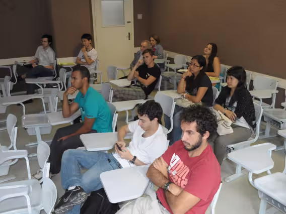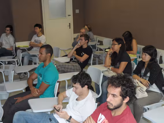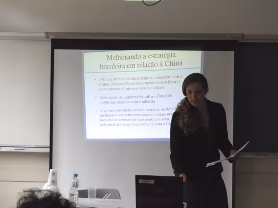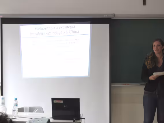 Alunos assistindo à palestra ''Desmistificando a entrada chinesa no Brasil'', ministrada pela pesquisadora Dawn Elisabeth Powell, da Comissão Fullbright.