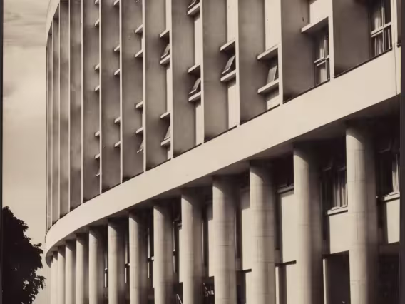Almoço, talvez referente ao Dia do Reitor, nos pilotis do Edifício Cardeal Leme, na altura do bloco C, no qual há acima dos elevadores a placa comemorativa da inauguração do campus Gávea.