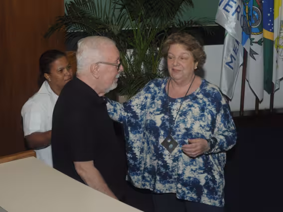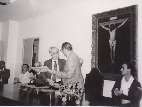 Reitor pe. Laércio Dias de Moura S.J. entrega ao professor Lindolpho de Carvalho Dias a Medalha do Mérito Cardeal Dom Sebastião Leme.