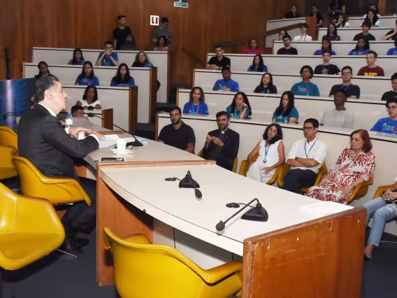 O Reitor Pe. Anderson Antonio Pedroso S.J., o escritor Wole Soyinka e o Vice-Reitor Pe. André Luís de Araújo S.J. no evento.