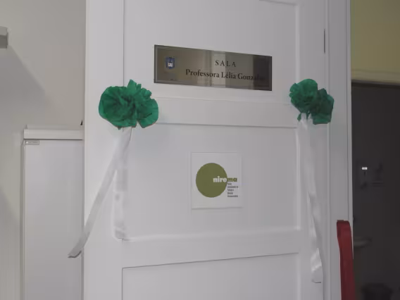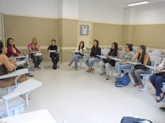 Palestrantes, equipe de mídia e plateia com alunos e professores durante o evento.