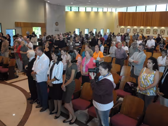 Código exclusivo mp0003_006 Coleção Missa em comemoração ao Sagrado Coração de Jesus, patrono da PUC-Rio Data de criação 15/06/2012 Natureza do documento imagem Tipo de documento fotografia cor Descrição Público presente à missa.