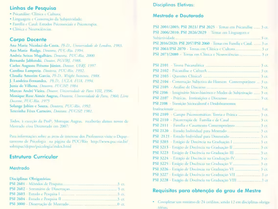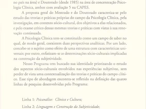 Contando a História do Curso de Pós-Graduação em Psicologia da PUC-Rio.Resumo: "Este texto conta a história do Curso de Pós-graduação em Psicologia da PUC-Rio. Em 1966, o Departamento de Psicologia implantou o primeiro Curso de Mestrado do país na área, que foi também o primeiro a ser credenciado pelo Conselho Federal de Educação em 1972. O Doutorado foi iniciado em 1985. A ênfase que predominou no Programa de Pós-graduação, desde seu início, foi na Psicologia Clínica, área em que possui grande tradição e incontestável liderança no Rio de Janeiro e no país. Contamos a história das reformulações pelas quais ele passou no sentido de acompanhar os novos desenvolvimentos da produção de conhecimento na área e, ao mesmo tempo, de exercer o papel de liderança que sempre lhe coube no cenário da Pós-graduação em Psicologia no Brasil."
