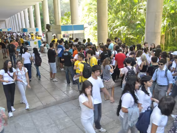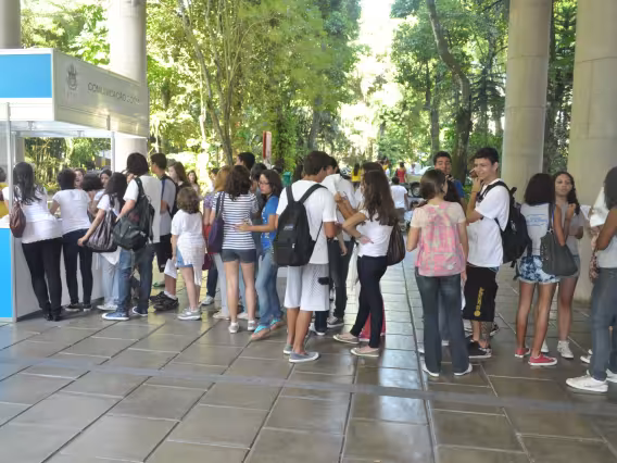 Visitantes nos pilotis no evento PUC por Um Dia. Stands de informações.
