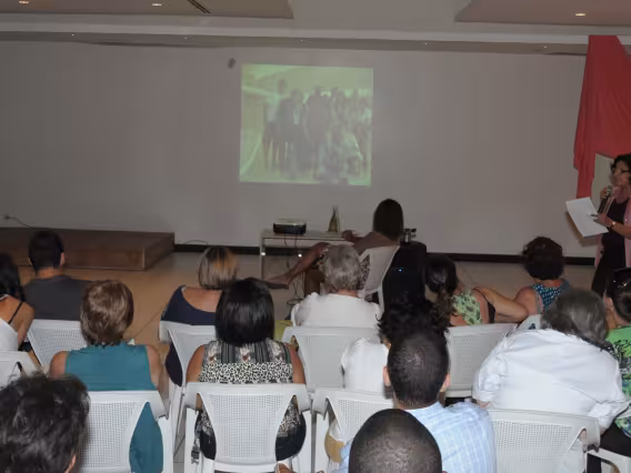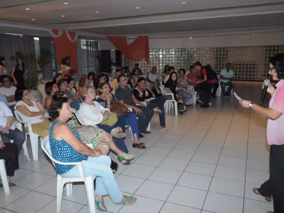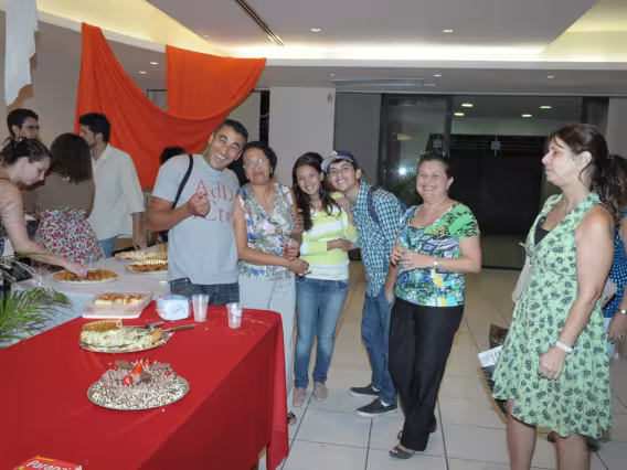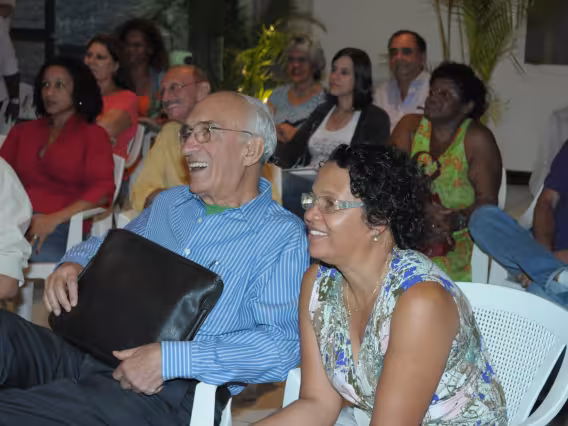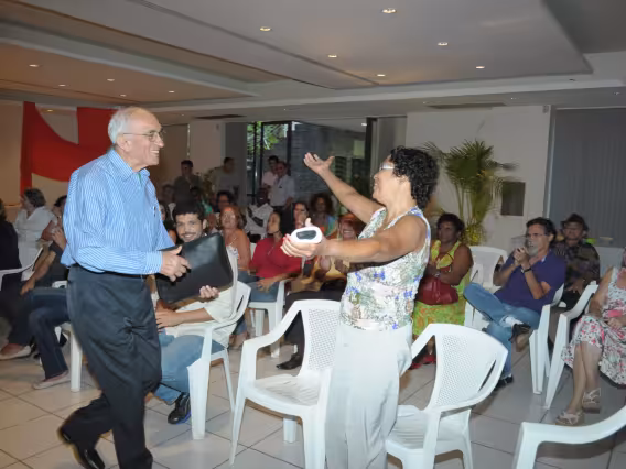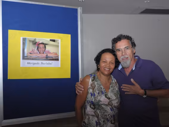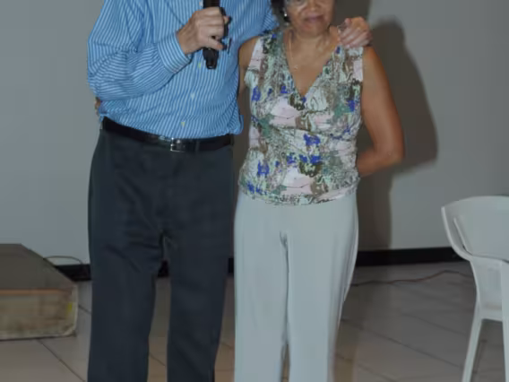 Dora posa para fotografia com convidado no evento em sua homenagem.