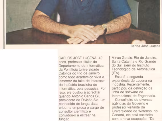 Matéria da Revista INFO sobre o prof. Carlos Lucena, com foto. Sobre seu trabalho na criação de um centro de pesquisas com a empresa SID Informática, junto com a Escola Politécnica da USP, a Unicamo, a UFMG, UFRJ, UFSC, UFRGS, o ITA e a PUC-RIo.