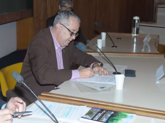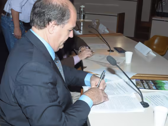 A PUC-Rio foi designada para celebrar o Dia Mundial do Habitat de 2011 no Rio de Janeiro. Na imagem, Alain Grimard, diretor da ONU HABITAT na América Latina e Caribe, firma o compromisso das Nações Unidas com a Universidade.