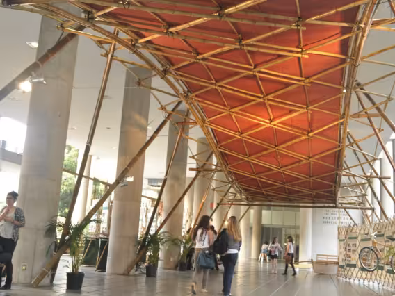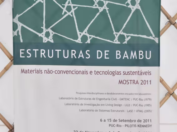 Exposição com estruturas e objetos feitos com bambu onde se mostra o uso de materiais não convencionais e tecnologias sustentáveis. Trabalho em barro, Laboratório de Living Design.